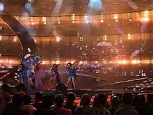 On 24 May 2008, No Angels started at number four during the show, following Albania's entry Olta Boka with "Zemrën e lamë peng" and preceding Armenia's Sirusho with "Qele Qele."[24] An estimated 100 million fans watched the show, and viewers from all 43 participating nations voted for their favourite performers via text message and telephone.[24] The band eventually ranked 23rd place out of the 25 countries that participated with a total of 14 points – taking twelve points from Bulgaria, Diakovska's native country, and two points from Switzerland. Only Poland and the United Kingdom placed below the four-member female band.[24][25] While never considered a pre-contest favourite (online betting firms such as Paddy Power previously put Germany's chances of winning at 100 to 1, in the lowest third of competitors),[25] the band was heavily criticized for their performance,[21] which they themselves later described as a failure, attributing bad in-ear sound and a high level of stage freight.[21] The following year, "Disappear" was succeeded as German representative at the Eurovision Song Contest 2009 by Alex Swings Oscar Sings (Alex C. and Oscar Loya) with "Miss Kiss Kiss Bang."[26]