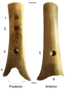 Turk's 1997 book reported that the holes have similar diameters which would accommodate fingertips, and all are circular instead of oval (as carnivore bites often are). Furthermore, all are in the proper ratio of bore size to hole size found in most flutes, and the bone is the kind (femur) usually used for bone flutes.