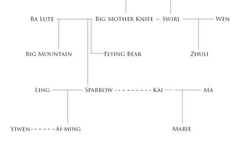 • Big Mother Knife: Big Mother Knife is the wife of Ba Lute, sister of Swirl, and mother to Sparrow, Flying Bear, and Big Mountain. She has a close relationship with her sister and has a hard time reconciling the horrors that Swirl faces with the political powers that Ba Lute fights for.