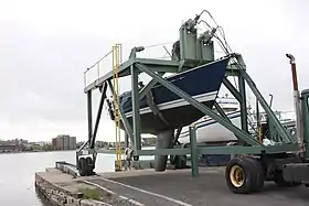 The 18-tonne (20-ton) travel lift of the Dobson Yacht Club. It can lift boats with length to 50 feet (15 m), beam to 15 feet (4.6 m), draft to 8 feet (2.4 m). The boat shown in the slings is 40 feet (12 m) long and draws 8 feet 2 inches (2.49 m)