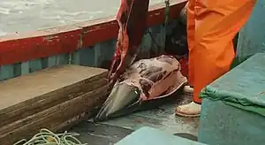 Though it is forbidden under Peruvian law to hunt dolphins or eat their meat (sold as chancho marino, or sea pork in English), a large number of dolphins are still killed illegally by fishermen each year.[18] To catch the dolphins, they are driven together with boats and encircled with nets, then harpooned, dragged on to the boat, and clubbed to death if still alive. Various species are hunted, such as the bottlenose and dusky dolphin.[19]
