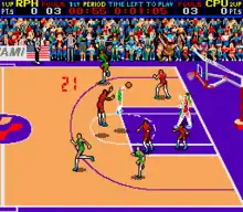 Double Dribble (ダブルドリブル, Daburu Doriburu) is an arcade basketball video game developed and released by Konami in 1986. It was the second basketball arcade video game by Konami, following Super Basketball. It was considered the most realistic basketball sports video game upon release, with fast-paced action, detailed players, a large side-scrolling court, innovative cinematic slam dunks, and detailed sound effects, beginning a trend where presentation would play an increasingly important role in sports games.[3]