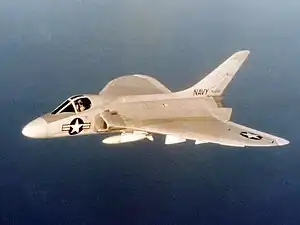 As the design was refined, it was decided to substantially reduce the wing's thickness to increase its high speed capabilities.[7] The twin J34 engine arrangement was also swapped out for a single Westinghouse J40 engine. Only a single hydraulic system was incorporated, thus measures to permit manual reversion in the event of hydraulic failure were also included.[8] Rockets also became the primary armament, which were housed in pylon-mounted pods underneath the wing. A formal operational requirement was issued by the Navy in 1948, however, according to aviation author Tommy H. Thomason, it was an apparently foregone conclusion that the contract would be awarded to Douglas from the onset.[8] Specifics of this requirement included the ability to intercept and destroy an enemy aircraft at an altitude of 50,000 ft (15,240 m) within five minutes of the alarm being sounded.[9] At the time, Navy planners were particularly concerned by the threat posed to its carrier battle groups by high altitude Soviet bomber aircraft; furthermore, as early jet aircraft were fuel hungry and had limited endurance, to maximise an interceptor aircraft time on station it was particularly desirable for such an aircraft to possess a relatively high rate of climb so that it could be launched and rapidly reach its operational altitude.[10]