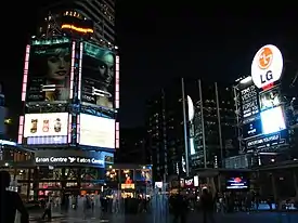 The Downtown Yonge area is best known as the home of the Toronto Eaton Centre indoor mall, Toronto’s largest and most visited tourist attraction. Adjacent to the mall, at the corner of Yonge and Dundas Street is Yonge-Dundas Square, a large public square. The area is well known for shopping, including music retailers, mid-priced fashion stores, and jewelers.