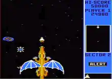 Draconian is a multidirectional shooter released in 1984. It was written by Mike Hughey and published via Tom Mix Software. The game was initially released for TRS-80 Color Computer and converted for the Dragon 32/64. Draconian is based upon the arcade game Bosconian where the player navigates a ship through scrolling space to destroy enemy bases.[4]