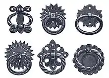 A drawer pull often includes an escutcheon plate to (or through) which the handle is fastened. The handle may swing from one or two mounts ("drop handle" or "swing handle"), a form of bail handle, making a drop drawer pull. The handle may also be permanently fastened to the plate. The plate may be ornamented by piercing, embossing, or engraving, and may receive decorative finishes such as plating, etching, and antiquing. Handle stock may be round, rectangular, or irregular forged shapes.[3]