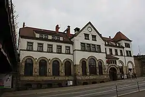 Plauen bei Dresden ("Plauen near Dresden") halt was opened on 18 June 1855 together with the Albertsbahn (Albert Railway) and was located to the left (south-east) of the railway. In 1897, the so-called Alte Bahnhof ("old station") Plauen was opened with the station building located near the right-hand side of the current tracks. Since the station was located quite poorly for the population of Dresden-Plauen, which had now grown to 12,000 people, a new station was opened about 800 m further north in January 1926 and the old station was closed.[26] This halt, opened in 1926, is to be renovated by the middle of 2018.[27]
