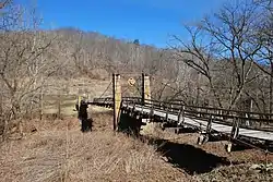 Duck Run Cable Suspension Bridge, also known as Trubada Swinging Bridge, is a historic cable suspension bridge that spans the Little Kanawha River at Trubada, Gilmer County, West Virginia. The bridge was built in 1922. The bridge is 351 feet, 7 inches, with a main span of 209 feet, 9 inches, and two half spans of 76 feet, 6 inches, and 65 feet, 4 inches. It features four reinforced concrete towers for the two wire rope cables.[2]