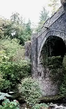 Dunans Bridge is a category A-listed structure,[1] designed by Thomas Telford. It is located at Dunans Castle on the Cowal peninsula in Argyll, Scotland. It was built for John Fletcher of Dunans,[1] to commemorate the battle of Waterloo. The bridge was completed in 1815, and predates the 1864 elaboration of Dunans House by Kerr into a Franco-Baronial "castle". The three-arched rubble construction is considered internationally important as it is the only extant bridge of this type. It stands over 15 metres (49 ft) from the river bed and has been voted one of Scotland's ten best bridges.[2] It was built to replace the now destroyed "swing bridge". Though it is of a kind often constructed by Telford, the three arches, gargoyles and eight hexagonal piers, as well as its sheer height 16 metres (52 ft), make it unique.