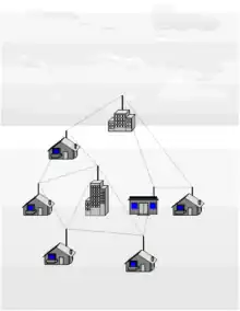 Wireless Mesh Network. Packets are relayed from one node to another until they reach their destination.