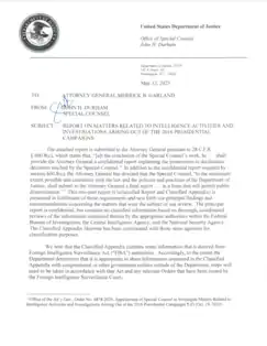 103. Durham, John (May 12, 2023). "Report on Matters Related to Intelligence Activities and Investigations Arising Out of the 2016 Presidential Campaigns" (PDF). Justice Department. Retrieved May 15, 2023.