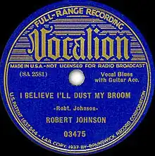 In April 1937, Vocalion Records issued "I Believe I'll Dust My Broom" on the then standard ten-inch 78 rpm record, backed with Johnson's "Dead Shrimp Blues".[24] The record was Johnson's second of eleven released during his lifetime.[25] An initial pressing of at least 5,000 was supplemented with another 900 copies released on Vocalion's budget labels Perfect Records and Romeo Records, which were sold by dime stores.[26] Conqueror Records, which were sold through Sears and Roebuck department stores and its catalogue, pressed an unspecified number, although Conqueror usually only issued Vocalion's best sellers.[24]