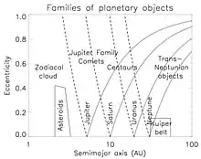 Giant Planets and families of planetary objects and interplanetary dust. Between the dashed and dotted lines connected to a planet is the scattering zone of that planet