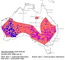 Lerista timida can be found from the blue mountain regions of NSW to southeast Western Australia. it is found to inhabit the dry interiors of QLD, NSW, VIC, SA and WA. The population is known to inhabit parts of the Northern Territory with populations being found close to Alice Springs.[3] Its southern population is in north-western Victoria and Populations have been recorded in Port Hedland WA and north of Mt. Isa Qld.[6]
