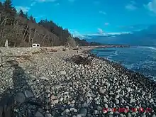 In 2016, as a response to what has been called the fastest erosion on the West Coast of the United States, the community of North Cove began placing unsorted pit-run basalt of predominantly cobble size along nearly 2 miles of shoreline to slow the erosion while engineers worked on a more permanent design.[10] The community nonprofit group Wash Away No More supported the project through fundraising and work parties.[11] Working with regulatory agencies, the principles of Adaptive management and Design with Nature were incorporated into the project to allow for learning and change based on periodic monitoring by Washington State Department of Ecology. As part of the monitoring, PIT tags were placed in individual rocks and their motion tracked over time. It was observed that the rocks that moved farthest weighed between 1 and 10 kg (2.2 and 22 lb) with an intermediate axis of about 10 to 20 cm (4 to 8 in). Angular and rounded rocks appeared to perform equivalently in this environment. Technical assistance and funding were provided by the Pacific County Conservation District. The lost beach quickly returned.[12][13]