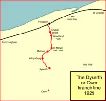 The Dyserth branch line was a short standard-gauge mineral railway between the northern end of the Clwydian Range at Dyserth and the North Wales Coast Line at Prestatyn.[3] The line was constructed by the London and North Western Railway in 1869; it was built to carry quarried stone and coal. The rise of tourism led to the introduction of a passenger service in 1905. There were stations at Dyserth and Meliden, and basic halts were built at other stopping places. Competition from road transport led to the passenger service being withdrawn in 1930.[4] With the eventual demise of all the mineral industries around Dyserth the entire line was closed in September 1973.