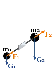 If the ratio of F1 to F2 differed from the ratio of G1 to G2, the rod would rotate. The mirror is used to monitor the rotation: a scale would be observed in reflection.