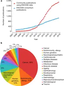 - ↑ "Fig. 3: Publications using ENCODE data. | Nature". Natureevents Directory. ISSN 1476-4687.