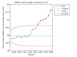 In statistical quality control, the EWMA chart (or exponentially weighted moving average chart) is a type of control chart used to monitor either variables or attributes-type data using the monitored business or industrial process's entire history of output.[1] While other control charts treat rational subgroups of samples individually, the EWMA chart tracks the exponentially-weighted moving average of all prior sample means. EWMA weights samples in geometrically decreasing order so that the most recent samples are weighted most highly while the most distant samples contribute very little.[2]:406