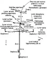 | Heat Flow Experiment (HFE) | The HFE was designed to make thermal measurements of the Lunar subsurface in order to determine the rate at which heat flows out of the interior.[6] The measurements could help determine the abundance of radioisotopes and help understand the thermal evolution of the Moon. The HFE consisted of an electronics box and two probes. Each probe was placed in a hole by an astronaut that was drilled to about 2.5 m deep. | |