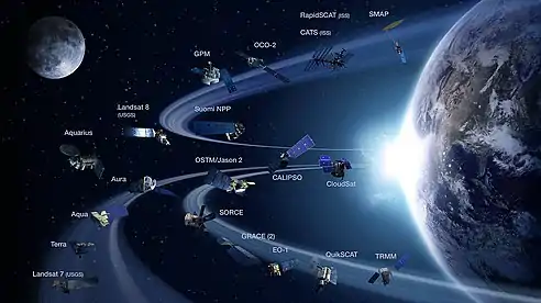 The Earth Observing System (EOS) is a program of NASA comprising a series of artificial satellite missions and scientific instruments in Earth orbit designed for long-term global observations of the land surface, biosphere, atmosphere, and oceans. Since the early 1970s, NASA has been developing its Earth Observing System, launching a series of Landsat satellites in the decade. Some of the first included passive microwave imaging in 1972 through the Nimbus 5 satellite.[1] Following the launch of various satellite missions, the conception of the program began in the late 1980s and expanded rapidly through the 1990s.[2] Since the inception of the program, it has continued to develop, including; land, sea, radiation and atmosphere.[1] Collected in a system known as EOSDIS, NASA uses this data in order to study the progression and changes in the biosphere of Earth. The main focus of this data collection surrounds climatic science. The program is the centrepiece of NASA's Earth Science Enterprise.