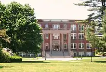 Both Gardner Hall (1930), originally named the Fowler Memorial Administration Building after Charles J. Fowler, and the original Floyd W. Nease Library (1953), now the Bower-Grimshaw Center for Institutional Advancement, were designed by Wesley Angell. Gardner Hall was designed in the Classical or Colonial Revival mode. Gardner is brick, three stories on a high granite basement, and capped by a parapet balustraded in the center. Corners are articulated with brick quoins. The fenestration is symmetric with double sash windows at regular intervals, trimmed in white, topped with flared brick lintels and a white keystone. It also features a two-story balustraded Doric portico of fluted cast stone columns. The portico is the backdrop for commencement ceremonies. The main entrance, at the end of wide stairs, is pilastered and topped with a bracketed entablature, which frames an arched glass opening. The side elevations have projecting stair towers, which indicate the site of a central hall running the length of the building. Originally rectangular in form, the 1953 addition of the then-Nease Library in the rear gave it a T-configuration.[69]