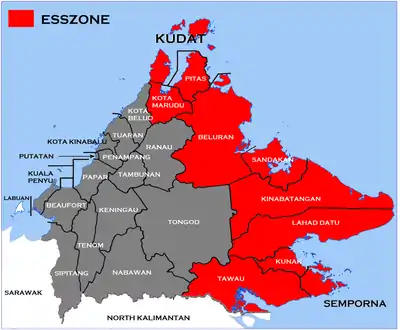 The Eastern Sabah Security Zone (ESSZONE) is a security zone in the Malaysian state of Sabah that was launched by Malaysian Prime Minister Najib Razak on 25 March 2013 following persistent attacks by pirates and militants from the southern Philippines that occurred in the eastern part of Sabah especially after the 2013 Lahad Datu standoff.[1] It includes the districts of Kudat, Kota Marudu, Pitas, Beluran, Sandakan, Kinabatangan, Lahad Datu, Kunak, Semporna and Tawau (including Kalabakan), which is neighbouring to the Philippines.[1][2]