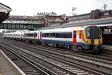 Eastleigh railway station serves the town of Eastleigh in the county of Hampshire in England. It is located on the South West Main Line and is the junction station for two other routes, the Eastleigh-Fareham Line and the Eastleigh-Romsey Line. It is 73 miles 35 chains (118.2 km) from London Waterloo. South of the station are Eastleigh Railway Works and Eastleigh Depot.
