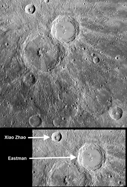 Eastman is a crater on Mercury first seen by MESSENGER during the mission's first Mercury flyby. Eastman exhibits some features characteristic of a fresh, relatively young crater. The walls of Eastman have clearly visible terraces, and the central peak structure is well preserved. Eastman is located near Xiao Zhao crater.[1]