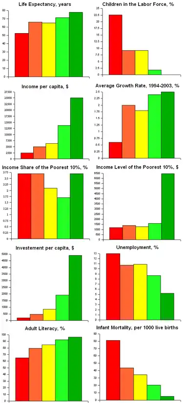 Economic freedom has been shown to correlate strongly with higher average income per person, higher income of the poorest 10%, higher life expectancy, higher literacy, lower infant mortality, higher access to water sources and less corruption. The share of income in percent going to the poorest 10% is the same for both more and less economically free countries.[6]
