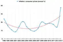 The Chávez government overspent in social spending, however, and did not save enough money for any future economic difficulties.[4] On 31 March 2000, Chávez initiated policies that resulted with the Venezuelan government spending more than it received as oil prices began to rise.[33] Poverty in Venezuela began increasing going into the 2010s.[34] During Chávez's campaign before the 2012 presidential election, he tripled Venezuela's deficit while on a "spending spree".[35] In 2014 El Universal reported that in the previous five years that included years under Chávez's policies, purchasing power for those with minimum wage jobs had dramatically decreased compared to other countries in the region, supposedly due to the high inflation rate and the multiple devaluations of Venezuela's currency.[36]