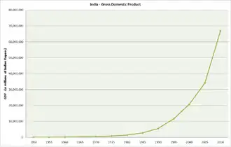 The economy of India has transitioned from a mixed planned economy to a mixed middle-income developing social market economy with notable public sector in strategic sectors.[48] It is the world's fifth-largest economy by nominal GDP and the third-largest by purchasing power parity (PPP); on a per capita income basis, India ranked 139th by GDP (nominal) and 127th by GDP (PPP).[49] From independence in 1947 until 1991, successive governments followed Soviet model and promoted protectionist economic policies, with extensive Sovietization, state intervention, demand-side economics, natural resources, bureaucrat driven enterprises and economic regulation. This is characterised as dirigism, in the form of the Licence Raj.[50][51] The end of the Cold War and an acute balance of payments crisis in 1991 led to the adoption of a broad economic liberalisation in India and indicative planning.[52][53] Since the start of the 21st century, annual average GDP growth has been 6% to 7%.[48] The economy of the Indian subcontinent was the largest in the world for most of recorded history up until the onset of colonialism in early 19th century.[54][55][56]