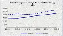 In 2017-18 total exports stood at A$2,230 million, while imports reached A$2,738 million, with a negative balance of trade of A$508 million. Services account for almost all exports (>99%) and imports (>90%) in the ACT. Since 2012-13, average annual goods and services exports growth has been 9.9%.[7]