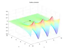 In fluid dynamics, an edge wave is a surface gravity wave fixed by refraction against a rigid boundary, often a shoaling beach. Progressive edge waves travel along this boundary, varying sinusoidally along it and diminishing exponentially in the offshore direction.[1]