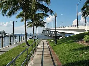 The original Edison Bridge was built to carry the Tamiami Trail, which had previously crossed the river on a narrow wooden bridge upstream that opened on March 12, 1924. This bridge was located in East Fort Myers at Freemont Street and connected to what is today known as Old Bridge Road in North Fort Myers.[4] Construction of the bridge at Freemont Street was initially started by a private company with the intention of making it a toll bridge. Lee County planned to initially use the bridge at Freemont Street for its portion of the planned Tamiami Trail, but the federal government would not designate it as part of a U.S. Highway if the bridge had a toll. So, the county purchased the bridge and completed its construction.[5]