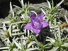 Edraianthus pumilio, the silvery dwarf harebell, is a species of flowering plant in the family Campanulaceae, native to Dalmatia in southern Croatia. It is an herbaceous perennial growing to 2.5 cm (1 in), forming a cushion of hairy, silvery-green leaves and bearing solitary violet upturned bell-shaped flowers in summer. It requires extremely free-draining, preferably alkaline, soil, and is best grown in an alpine garden or rockery.[1][2]