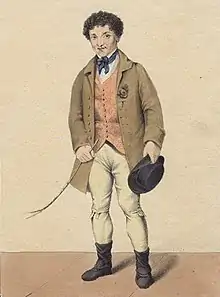 Engaged by Richard Wroughton, on a report from John Bannister, for Drury Lane Theatre for three years, Knight arrived with wife and children in London, only to find the theatre burnt down. It was at the Lyceum, where the company moved, the Knight made his first appearance in London, 14 October 1809, as Timothy Quaint in the Soldier's Daughter (Andrew Cherry), and Robin Roughhead in Fortune's Frolic by John Till Allingham. He built on success with Label in The Prize (Prince Hoare), and his creation of Jerry Blossom in Isaac Pocock's Hit or Miss, 26 February 1810, in which he and Charles Mathews as Cypher saved the piece.[2] With the company he went to the new theatre in Drury Lane, where he remained constant until his death. Simple in the Merry Wives of Windsor, 23 October 1812, is the first part in which he can be traced there. The Clown in Twelfth Night and Little John in Robin Hood were given during his first season. He played typically domestics, rustics, and farm-labourers.[3] Among his original parts were Tom in The Intrigue and Farmer Enfield in The Falls of Clyde.[1]