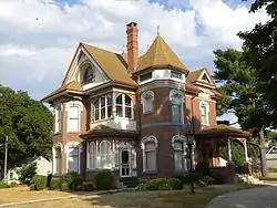 The Edwards-Swayze House is a historic building located in Nevada, Iowa, United States. Clayton F. Edwards, a local merchant, had this house built in 1878. He sold the house to Emma Swayze, the wife of banker W.F. Swayze, in 1890 when he relocated to Kennard, Nebraska. The house follows a vernacular form with elements of the Queen Anne style that were not fully integrated or carried though.[2] The 2+1⁄2-story brick structure features an irregular plan, octagonal turret, hip roof, shingled gable ends, enclosed porches, and window hoods. It was listed on the National Register of Historic Places in 1978.[1]