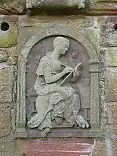 The carvings are all based on popular series of engravings, which were often published in pattern books. Nuremberg was the origin of numerous such books, and one may have been brought to Edzell by the miner Hans Ziegler.[31] Specifically, the images of the deities are derived from engravings of 1528–29 by the German artist Georg Pencz (or Iorg Bentz, c. 1500–1550), a pupil of Albrecht Dürer; the initials I. B. appear on the carving of Mars. The arts and virtues are both based on engravings derived from paintings by the Flemish artist Marten de Vos.[32] The engravings, by Jan Sadeler and Crispijn de Passe, were widely distributed in Scotland, along with those of the deities. Indeed, the image of Prudence is identical to that used by the King's Master of Works William Schaw, in the spectacular display to welcome Queen Anne to Scotland, following her marriage to James VI in 1589.[33]