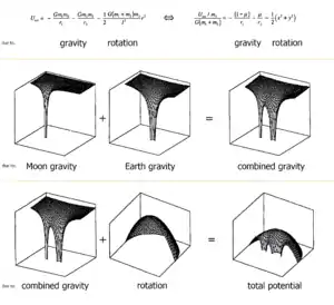 Components of the effective potential of two rotating bodies: (top) the combined gravitational potentials; (btm) the combined gravitational and rotational potentials