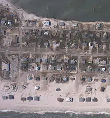 On Santa Rosa Island, the hurricane produced a storm surge of 7 feet (2.1 m), over washing parts of the low-lying island on the eastern and western shores. In Apalachee Bay, storm surge of 15 feet (4.6 m) inundated parts of St. Marks and nearby locations, which was higher than previously anticipated and was thought to be enhanced by an oceanic trapped shelf wave that propagated northward along Florida's west coast.[31] As a result, sea water washed ashore up to eight blocks inland.[32] The surge, in combination with the high surf, caused moderate beach erosion and wiped out 80 percent of the sea turtle's nests.[26] Along the coast, severe beach erosion occurred as a result of the storm, mostly in Walton, Bay, Gulf, Franklin and Wakulla counties.[33] As a result of the pounding surf, the Navarre pier was ripped apart in two places.[16] Navarre Beach was one of the hardest-hit areas, with almost every structure receiving some type of damage.[34]