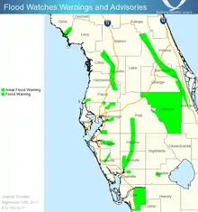 Early on September 9, the hurricane watch on the Gulf Coast was extended to Indian Pass, while the hurricane watch on the Atlantic coast was stretched northward to Fernandina Beach. The hurricane warning was changed to include areas from the Anclote River southward on the west coast and from the Brevard-Volusia county line southward along the east coast. At 09:00 UTC, the hurricane warning was extended on the west coast to include areas from the Chassahowitzka River southward and on the east coast to include areas from the Flagler-Volusia county line southward. Six hours later, the hurricane warning was extended again to include areas from the Aucilla River southward on the Gulf Coast and from areas from Fernandina Beach southward on the Atlantic coast. A tropical storm watch was also issued from Indian Pass to the Okaloosa-Walton county line, which was upgraded to a tropical storm warning at 21:00 UTC on September 9. The hurricane warning was then updated to reach its greatest extent, covering the entire east coast of the state, the west coast from Indian Pass southward, and the Florida Keys. The watches and warnings were discontinued or downgraded as the storm passed through the state and weakened, with the last remaining warning canceled at 21:00 UTC on September 11.[1] Several storm surge watches and warnings were also issued due to the threat of significant storm surge and tides, including a projected 10 to 15 ft (3.0 to 4.6 m) surge from Cape Sable to Captiva Island.[22]