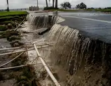 Beach erosion in Boca Raton resulted in the loss of about 80 ft (24 m) of sand. Beaches in the city suffered several millions of dollars worth of damage. Winds downed a number of large trees, especially ficus, in the city's older neighborhoods.[92] A large tree fell on a building at the Tri-County Animal Rescue, causing a portion of the roof to collapse and forcing workers to evacuate 50 animals.[93] About 51% of traffic lights were damaged and 33% were not operating due to power outages.[92] Farther north, a roof collapsed in Kings Point.[94] In Wellington, some townhouses at the French Quarter neighborhood were damaged, losing roof tiles, siding, and insulation.[95] Two apartment buildings In Riviera Beach suffered extensive roof damage, causing rainwater to enter several units in both buildings. Police and firefighters rescued about 60 people from the apartments.[96] On Singer Island, a condo was condemned due to damage from the storm. Damage in Rivieria Beach totaled about $3.6 million.[97] In the county's western communities along Lake Okeechobee – Belle Glade, Pahokee, and South Bay – impact was primarily limited to flooded streets, downed trees, and some damaged mobile homes.[98]