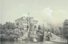 The main building is designed in the Neoclassical style and is surrounded by moats. It is a simple, two-storey white-rendered building with a rounded avant-corps towards the garden. Windows and doors have sandstone framing.[4] The building is topped by a hip roof with black-glazed tiles.[3]