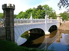 The surviving 'Tournament Bridge' was built to provide an appropriate crossing point to gain access to the far side of the Lugton Water and the Eglinton Kennels, circa 1845. Archibald Montgomerie, the 13th Earl of Eglinton had the bridge built in a Gothic style, using cast iron for the arches, pinnacles, etc. and stone for the two pairs of miniature ornamental towers at either end. These towers have subtle design differences (see photographs) which are significant in the context of the extended history of the bridge. This 'Tournament' bridge is said to have been designed by the architect David Hamilton; agreement to build the original three arched bridge was reached on 16 October 1799 by the 12th Earl of Eglinton and Hamilton's first recorded work dates from 1807. An Adam Russell is recorded as being partner to the agreement.[1] The first bridge is described by Aiton in 1811 as "a bridge of three arches, the piers of stone, and the arches of cast-iron, of the most elegant device, imitating the gothic style of the castle, with the family arms in the centre, now building about 100 yards below the castle, where the river is 102 feet broad".[2]