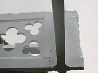 The lower courses of ashlar[28] on the bridge abutments and central pier were vermiculate.[29] At some point the height of the weir beneath had been raised using an odd assortment of re-used stonework; this would have increased the depth and extent of the waters behind it. The central pier and the original weir had used reworked but re-cycled stone, probably from Kilwinning Abbey; as illustrated by a stone window surround recovered during restoration work (See illustration).