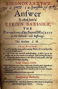 Milton believed, certainly, that the Eikon Basilike created a false idol and he wanted to destroy it with truth.[3] Eikonoklastes, titled Eikonolastes in Answer to a Book Intitl'd Eikon Basilike, The Portrature of his Sacred Majesty in his Solitudes and Sufferings, was issued in two versions in October 1649, in English, and was enlarged in 1650. It was quite soon translated into Latin and French. In 1651 a reply appeared, Eikon Aklastos ("the icon unbroken").[4] It was written by Joseph Jane, involved in royalist organisation.[5][6]