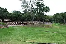 The North Ballcourt is constructed by three layers of large flagstones. There are six carved panels with ritual scenes and an ornamental frieze that runs along both walls. The court is 87 feet (27 m) long, which is considered to be unusually small and has vertical rather than sloping walls. It is probably one of the oldest structures at Tajín.[54]