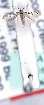 The wingspan is 5.6–6 mm for males and about 6 mm for females. The ground colour of the forewings is grey basally, with dark grey-tipped scales. The hindwings are grey.[1]