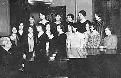 Smith's teaching style differed from conventional music instruction at the time in that she required instrumental students to study voice.[24] Piano, organ and violin instruction was offered[2] by 1907. Gertrude Madeira Smith,[20] Eleanor's sister,[2] gave organ instruction and Charles Moerenhout of the Chicago Orchestra taught violin. Five assistants also helped the teachers.[20] Smith felt that adding vocal training gave a level of experience that was neglected by singular focus on memorization of scales and structural drills usually prevalent for those learning instruments. She also incorporated songs from the students' homelands as a way to intermingle their old cultures with their new lives[24] and made efforts to involve their parents in the development of the curricula. As a progressive reformer, Smith advocated that inclusive diversity was a means of building a cosmopolitan citizenry united by pursuit of music excellence.[25] She also encouraged students to compose music from their earliest instruction and to recover songs from their cultural backgrounds.[26]